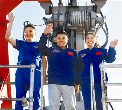 国家海洋局第二海洋研究所研究员陶春辉(左)、潜航员唐嘉陵(中)和女潜航员学员张奕出“蛟龙”号载人舱,向队友挥手致意(1月10日摄)。