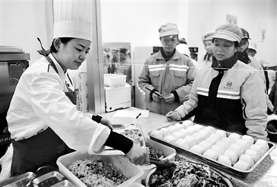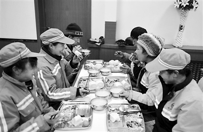 1月12日,在兰州市城关区亚太慈善定西路餐厅,几名环卫工人坐在一起吃早餐。