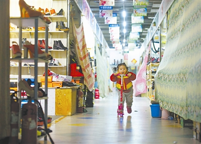 1月12日,一名小朋友在空荡的天皓成服装批发市场内玩滑板车。