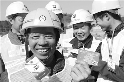 1月12日,湖南省益娄高速公路宁乡段六标农民工手持“工薪卡”,喜不自禁。