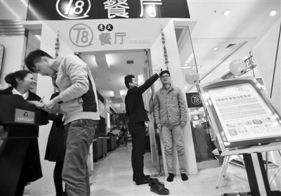 1月11日,中午1时许,在武汉中南路银泰百货内的一家餐厅门口,迎宾员随手发给用餐者一张广告单,上面写着“带上高个子,吃饭打5折。”图为餐厅门口专门备有测量身高的台子,规则是必须脱鞋。