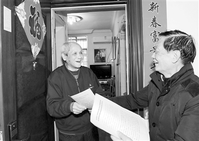 1月14日,黄以孟老人(右)将打印好的十八届中央纪委五次全会学习材料送到社区居民家中。