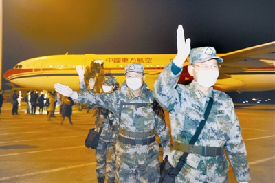 1月16日,中国援非抗埃医疗队首批回国队员向前来迎接的人挥手致意。