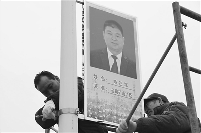 元月8日,安徽神源煤化工有限公司政工部将18位先进人物的“明星照”,高高悬挂在公司“功臣路”的路灯上,引来众多员工驻足观看。