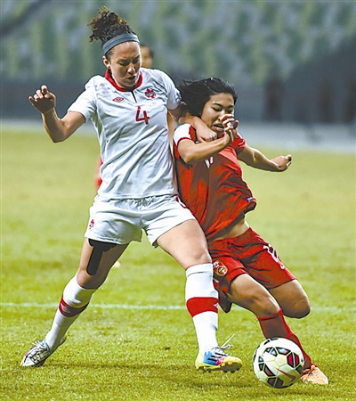 1月15日,在“宝安杯”2015中国足协深圳国际女足邀请赛中,中国队以1比2不敌加拿大队。三场比赛1平2负,最终获得第三名。图为中国队球员古雅沙(右)在比赛中拼抢。新华社记者 毛思倩 摄
