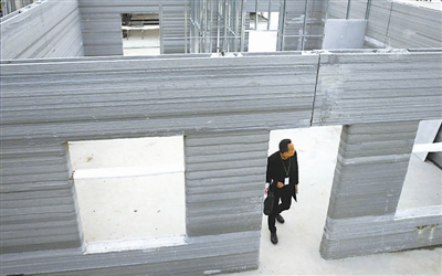 近日,数幢使用3D打印技术建造的建筑亮相苏州工业园区。这批建筑包括一栋面积1100平米的别墅和一栋6层居民楼。这些建筑的墙体由大型3D打印机层层叠加喷绘而成,而打印使用的“油墨”则由建筑垃圾制成。 新华社记者 裴鑫 摄