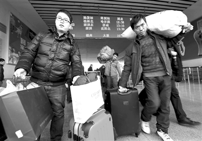 1月18日,安徽亳州,外出务工的农民工带着行李下火车走出火车站。随着农历羊年春节的日益临近,该站每日迎来大批外出务工返程客流,一些外出务工的农民工为避开春运高峰,提前购票返乡,与家人团聚。刘勤利 摄/CFP