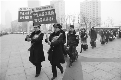 近日,针对到来的节前学生流高峰,拥有全国首家铁路车站服务品牌“阳光家园”的青岛火车站,联合青岛公交集团推出“温暖学生回家路”主题服务活动,车站为大学生旅客网上优先办理团体票,公交集团开行专车进校园接送学生到火车站,车站则为学生提供专人引导、专用通道进站、专区候车等一系列“阳光服务”,公铁无缝对接,深受大学生旅客好评。图为青岛火车站工作人员引导大学生旅客进站。