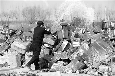 1月19日,西安市公安局对入冬以来收缴的6000多箱非法劣质烟花爆竹进行了集中销毁。 梁萌 摄/CFP