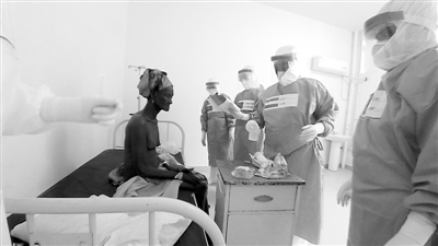 1月15日,我军第三批援塞医疗队抵达西非塞拉利昂后,第一时间来到首都弗里敦市郊的中塞友好医院埃博拉患者留观治疗中心,穿戴好11件防护用品、经过36道程序,与埃博拉患者“零距离”接触,实行“心贴心”式医疗服务。 洪建国 摄