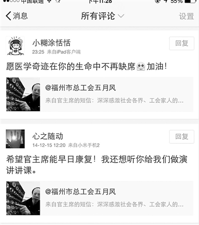 “主席加油!”“建议主席试试粒子植入疗法。”……在来电记录上,记者看到了来自四面八方的善意和温暖。在微博上,网友“若凡”留言:“我能做的有限,但是‘我们’能做的就是无限。让我们一起把祝福传出去,救救最美工会主席!”