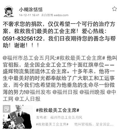 本报报道还引发了网友的强烈反响,一日之间,微博上由福州市总工会发起的“救救最美工会主席”的话题阅读量突破1.2万人次,市总工会公布的24小时“求助热线”不断响起,86名爱心网友纷纷来电支招,为最美工会主席的生命助跑。