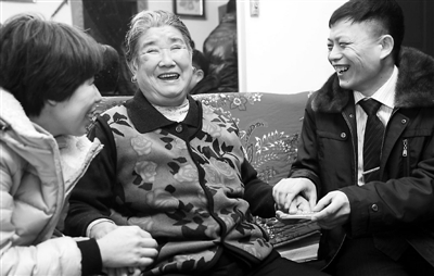 1月26日,河北省能工巧匠、技术能手、秦皇岛市劳动模范王勉(右)来到秦皇岛市港区临河里社区低保户闫秀珍(中)家中,送去米、面、油和价值500元的按摩卡,闫大娘高兴得合不拢嘴。在春节即将来临之际,王勉共选取了10户社区贫困家庭,自掏腰包购买生活物品进行慰问。