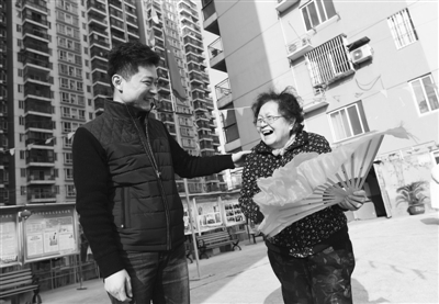 陈卿(左)和一位老人在养老院的广场舞平台聊天。