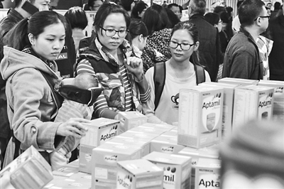 近日,广州首家跨境直购体验店在珠江新城正式试营业,妈妈们组团购买进口奶粉。体验店以母婴用品、生活家居、美肤护理、红酒洋酒为主打,商品种类多、小额免征税,消费者凭身份证信息实名购买,现场下单提货。 中新社发 陈骥旻 摄