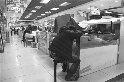 顾客稀少,留守的店员趴在柜台上打盹。