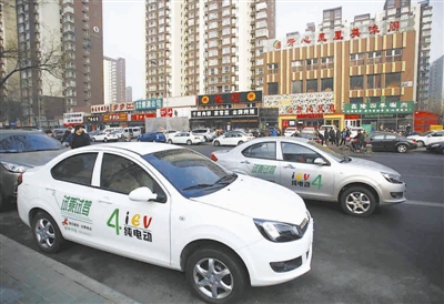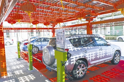 图③: 日前,100个充电桩在北京华贸中心正式启用,使北京的新能源汽车车主在核心商业区有了大型公共充电站。据了解,目前北京市已经建成1500台新能源小客车公共充电桩,1000台已经投入使用,其中60%的充电桩位于五环内。詹敏 摄/东方IC