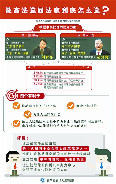 最高法同时发布《最高人民法院关于巡回法庭审理案件若干问题的规定》,其中规定,巡回法庭是最高法派出的常设审判机构。巡回法庭作出的判决、裁定和决定,是最高法的判决、裁定和决定。规定显示,最高法第二巡回法庭设在辽宁省沈阳市,巡回区为辽宁、吉林、黑龙江。规定从2015年2月1日起实施,最高法巡回法庭届时将开始受理和审理案件。