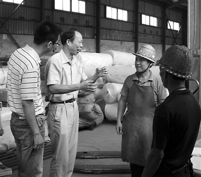 官祖振(左二)到车间调查职工对工资集体协商的满意度。薛晓秋 摄
