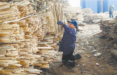 胡凤莲在工厂里把木材捆好后,堆放在一边。