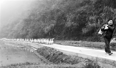 1月22日, 返乡苗族大学生邰彦武在养鹅场给鹅喂食。邰彦武是台江县台拱镇南省村人,2008年7月从凯里学院毕业后返回老家,瞅准了养鹅。由于肉鹅市场需求旺盛,价格稳中有升,养鹅市场前景看好,刺激了邰彦武的养鹅积极性。