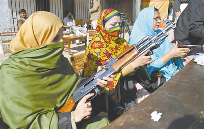 当地时间2015年1月27日,巴基斯坦白沙瓦,巴基斯坦学校教师手持不同武器,参加武器训练。在塔利班制造了白沙瓦军校惨案之后,当地政府启动了针对女性教师的特别武器训练项目,以提高其自卫能力,抵御恐怖袭击。 东方IC供图