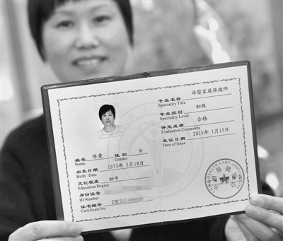 1月30日,一名母婴家庭保健师在展示自己的行业培训证书。
