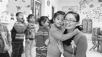 图为孩子们已穿上“爱心妈妈”织好的毛衣,依依不舍和“妈妈”合影留念。