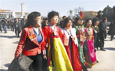 3月3日下午,中国人民政治协商会议第十二届全国委员会第三次会议在北京人民大会堂开幕。这是几名身着盛装的政协委员步入会场。 本报记者 许之丰 摄