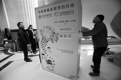 3月2日,记者在中国职工之家看到,工作人员正在组装一个倡导环保理念的“爱心屋”——代表们可以把看过的报纸杂志投进去,以便回收利用,而所得款项将用于慈善。