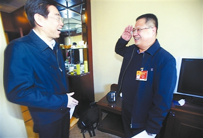 3月3日,全国人大代表、人社部原副部长王晓初拿着议案向朱良玉征求意见。