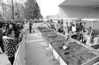 3月2日,太原,众多孩子在挖掘机游乐设施上玩,忙坏了一旁手持铁锹铲土的工人。当日,某园区庙会内“挖掘机”儿童互动游乐设施吸引了众多孩子。现场,为了确保游乐设施正常运转,一名手持铁锹的工作人员不时地将沙土回填,前来体验的孩子人数众多忙坏了现场工作人员。据了解,体验此项目每次收取20元人民币,庙会此游乐项目每日收入近万元。CFP 供图