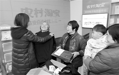 1月6日,浙江临安市昌化镇白牛村69岁的汤观凤大妈(左2),在“村淘4S店”服务站点,从村淘服务员张青手中接过2天前从网上订购的保暖内衣。东方IC供图