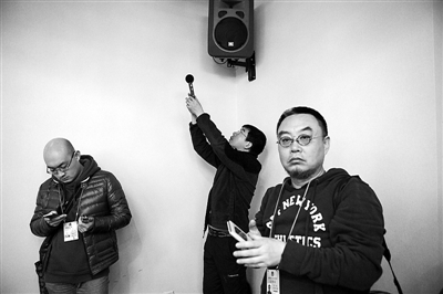 3月4日,全国政协十二届三次会议举行第一次小组讨论。一名记者在会议室音箱下高举录音笔记录委员发言。 新华社记者 才扬 摄