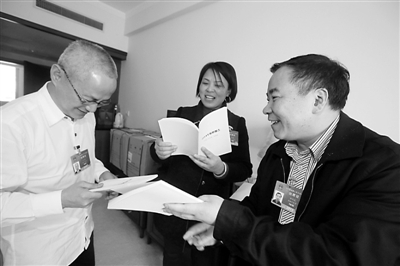 3月6日中午,在参加十二届全国人大三次会议的湖南代表团驻地,来自企业一线的职工杨淑娣代表(图中)听说身为企业家的田儒斌代表(图右)自己印制了一本《2014年履职报告》的小册子,便主动上门讨要。这一幕被从门口经过的叶文智代表看见也要了一本。田儒斌代表今年来北京参加两会时带了100本履职报告,现在只剩下了不到10本。本报记者 杨登峰 摄