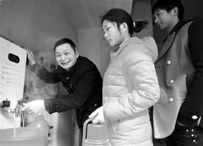 为解决环保与生活用水的矛盾,执行好市经信委关于整治小型窑炉的相关规定,国网上海奉贤供电公司和区环保局合作,经过前期准备,将南桥镇六墩村、奉城镇高桥村这两个外来人口较为集中“城中村”作试点,已经在春节前完成了2处电锅炉取代老虎灶的改造,年内完成42个熟水店电锅炉改造,供电公司将提供相应的供电配套服务,为实现奉贤“水更清、天更蓝”的目标而努力。图为六墩村暂住居民在全区第一台完成改造的电锅炉下接开水。