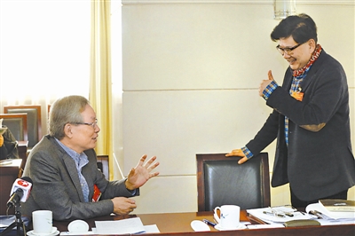 3月7日,在十二届全国人大三次会议上海代表团会议间隙,曹可凡代表(右)为王战代表的观点“点赞”。王战代表认为,目前我国一些城市群没有带动中小城市发展,原因之一在于轨道交通没有成网络,使很多中小城市无法成为通勤城市,这是我国新型城镇化建设中一个值得注意的问题。 新华社记者 沈伯韩 摄
