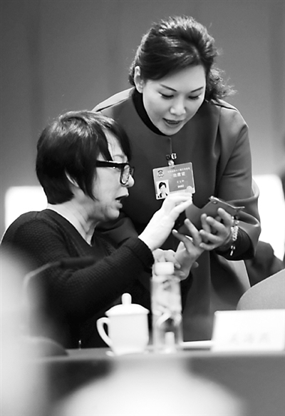 ⑤ 3月7日下午,政协妇联组讨论会前,翟美卿委员(右)将“留守儿童迫切需要生活照顾和心理抚慰”的信息传递给张黎明委员(左)相互交流。