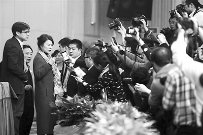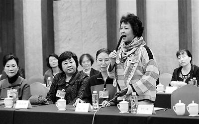 ④ 3月7日下午,全国政协十二届三次会议妇联界小组讨论会结束后,李羚委员即兴表演了小节目,庆祝即将到来的“三八”妇女节。