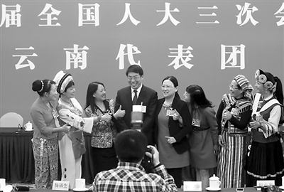 ② 3月7日上午,云南代表团讨论会后,7位女代表合影留念,一位男代表在旁边打趣道,“提前祝你们‘三八’节快乐 !”女代表们听闻立刻把他拉进来一起合影,并为他点赞。