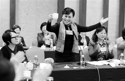 ① 3月7日下午,全国政协十二届三次会议妇联界小组讨论结束后,女委员们纷纷用唱歌、朗诵、写祝福语的方式庆祝“三八”妇女节的到来。图为王瑛委员以茶代酒,把一首《一杯美酒》歌曲献给姐妹们。本报记者 许之丰 摄