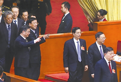 3月8日下午,十二届全国人大三次会议在人民大会堂举行第二次全体会议。会议开始前,最高人民法院院长周强(图中左)和最高人民检察院检察长曹建明手指前方,寻找自己的座位。