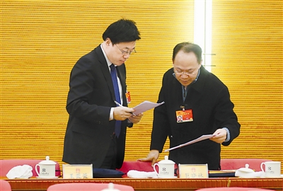程京代表首先找到了中国工程院院士邓中翰代表(下图),两人在工作中有诸多交集,邓中翰代表愉快地在“建立‘治未病’国家体系”建议书上签了自己的名字。随后程京代表来到北京律师协会会长李大进代表跟前,阐述自己关于人才交流的建议(上图),直到说服李大进代表在建议书上签名。此时,代表们大多已返回驻地,程京代表希望在接下来的会议上再找一些代表签名,尽快提交自己的建议。