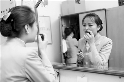 图为孙娜在为人大代表上水间隙,检查仪容,抓紧时间补妆,保证以最好的精神面貌提供服务。