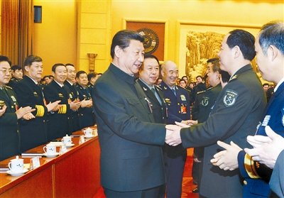 3月12日,中共中央总书记、国家主席、中央军委主席习近平出席十二届全国人大三次会议解放军代表团全体会议并发表重要讲话。这是习近平同军队人大代表亲切握手。