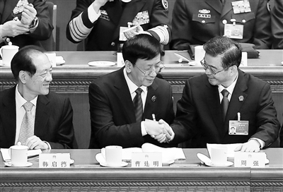 3月12日,十二届全国人大三次会议举行第三次全体会议,听取和审议最高人民法院院长周强和最高人民检察院检察长曹建明作工作报告。图为周强(右一)与刚作完报告的曹建明握手致意。本报记者 杨登峰 摄