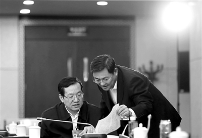 3月13日上午,在参加十二届全国人大三次会议的内蒙古代表团驻地会议室,鄂尔多斯市市长廉素代表(图右)和内蒙古自治区副主席常军政代表一起审议两高报告。去年,内蒙古因呼格案和腾格里沙漠污染事件引起社会关注。 本报记者 杨登峰 摄