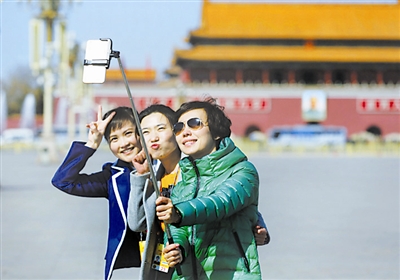 3月13日下午,全国政协十二届三次会议在北京人民大会堂闭幕。经过11天的紧张工作,参加两会政协报道的记者在天安门广场拍照,为自己的采访留下美好瞬间。本报记者 杨登峰 摄
