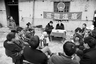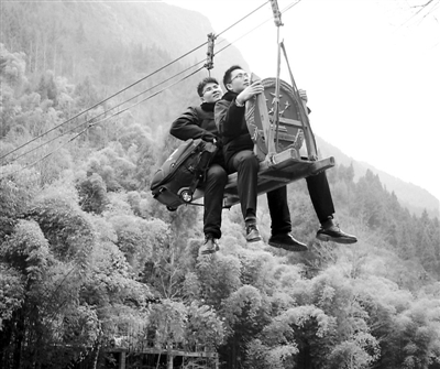 2015年3月9日,重庆奉节,法院法官通过绳索进入深山,设立巡回法庭处理案件。