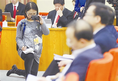 3月12日,在上海代表团小组讨论会上,一位女记者单膝跪地,一手拿照相机拍摄,一手用笔记录。本报记者 杨登峰 摄